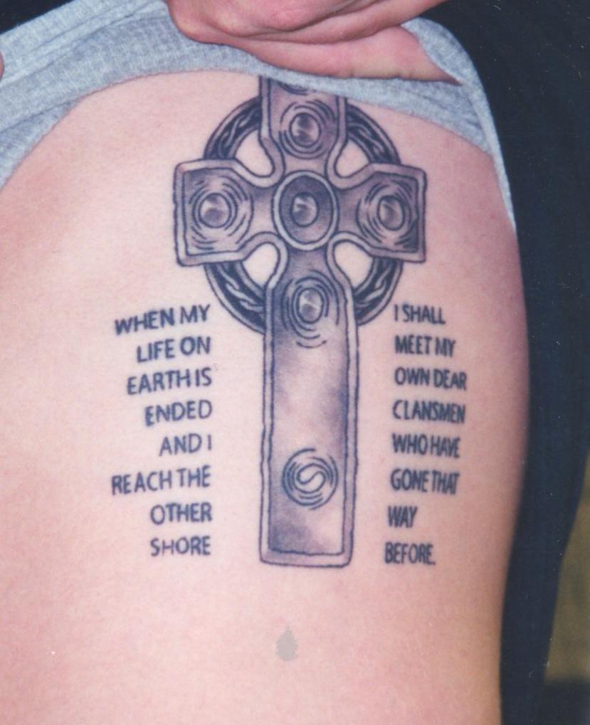 Yes, these tattoos on our children can be a bit shocking:) But I love the idea of your daughter’s celtic knot. Wish I’d been braver when I was younger! This particular son’s tattoo – – he is career army. He didn’t get any tattoos for years while other soldier friends had them all over! He wanted to wait and find something special. After his first deployment to Iraq he came home and found that verse on the Clan McGillivray’s website and the cross idea somewhere else. He has something special now….and large:)