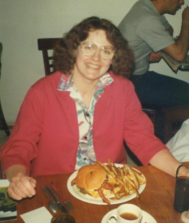 Also among the box of “treasures” – pictures of me, out with co-workers at the Donald Cafe’, circa 1990. I’m actually eating that ginormous bacon cheeseburger and fries. Why on earth do I have such huge eye glasses? And where did the big, curly hair come from? I’ve been fat so long I’d forgotten I have a small dimple in my left cheek like my grandpa. I would like my dimple back. I will gladly give away the fat.
