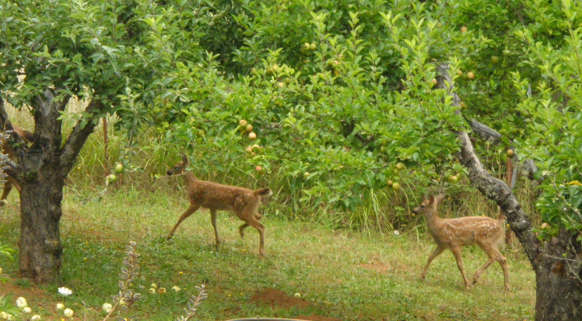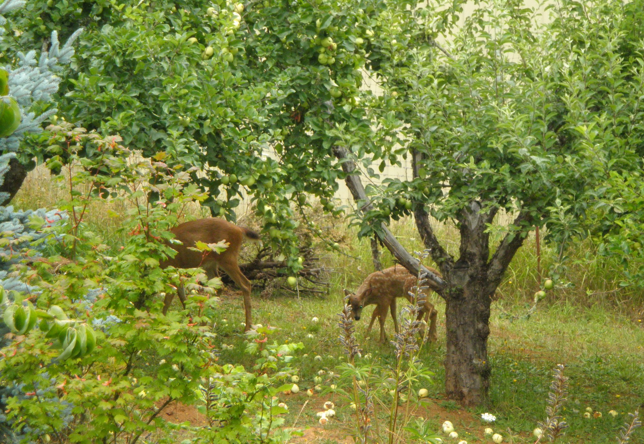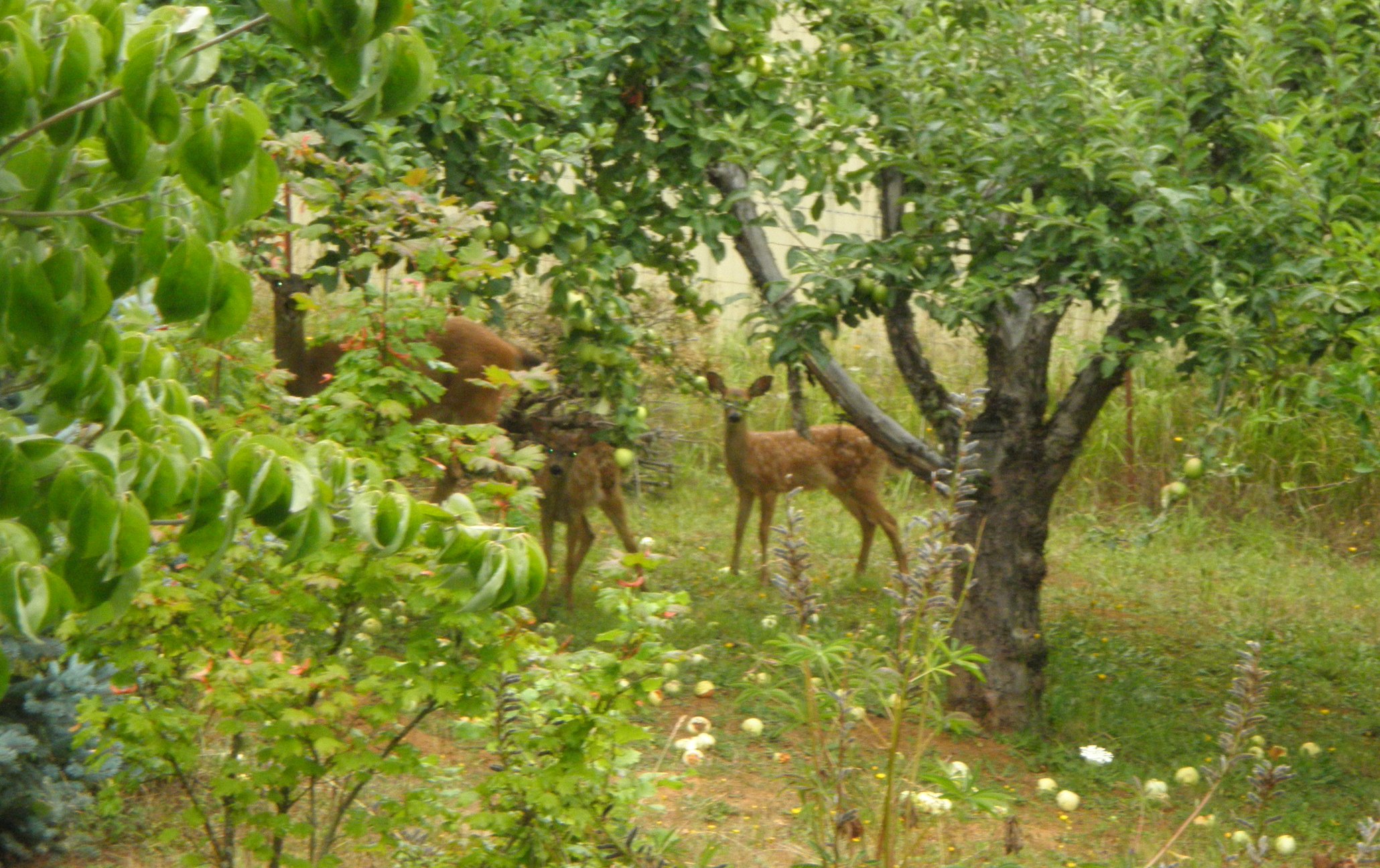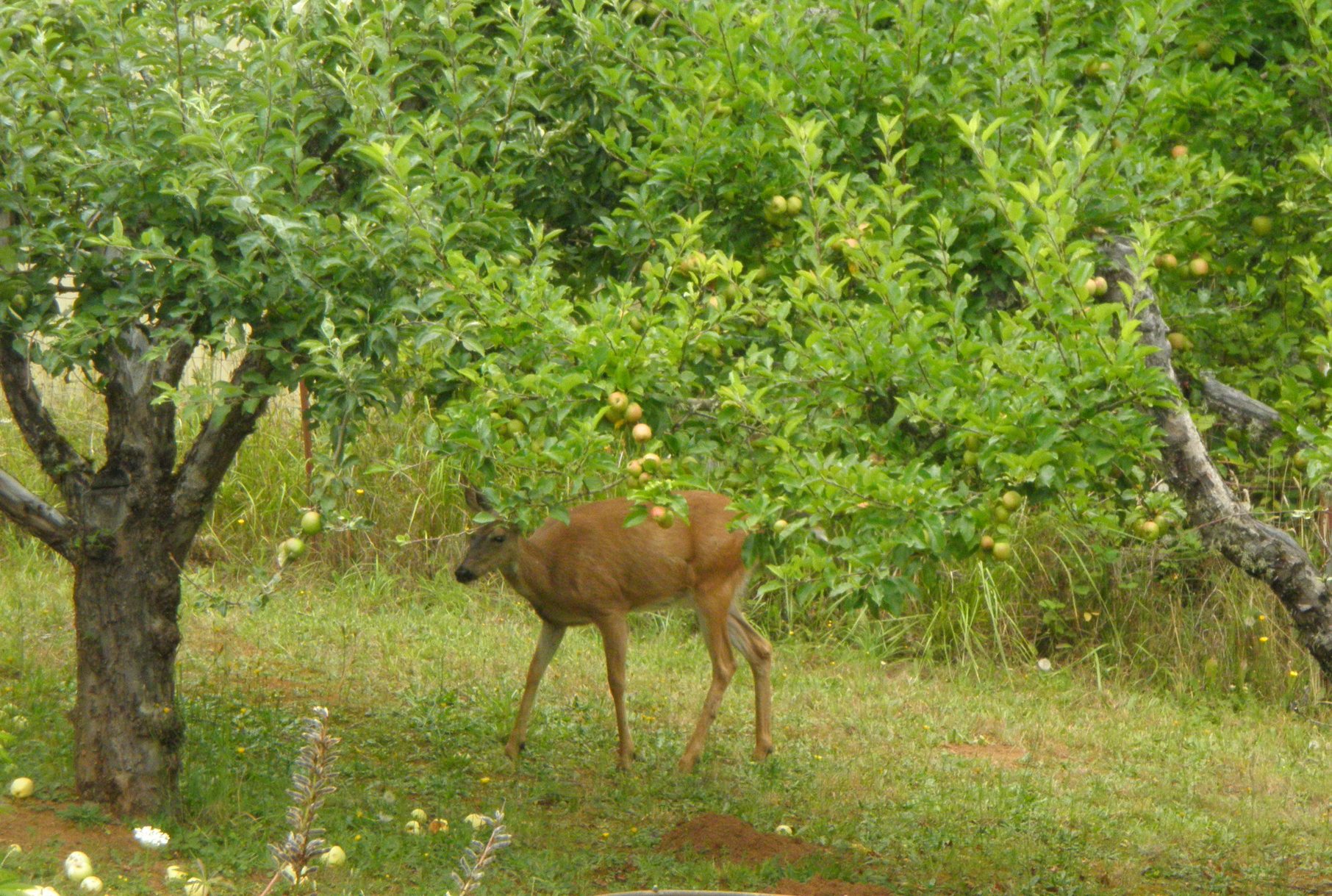 Last winter three adult deer visited the yard regularly. There’s plenty to eat around here, so that was no surprise. They were very fond of the apples on the ground.
