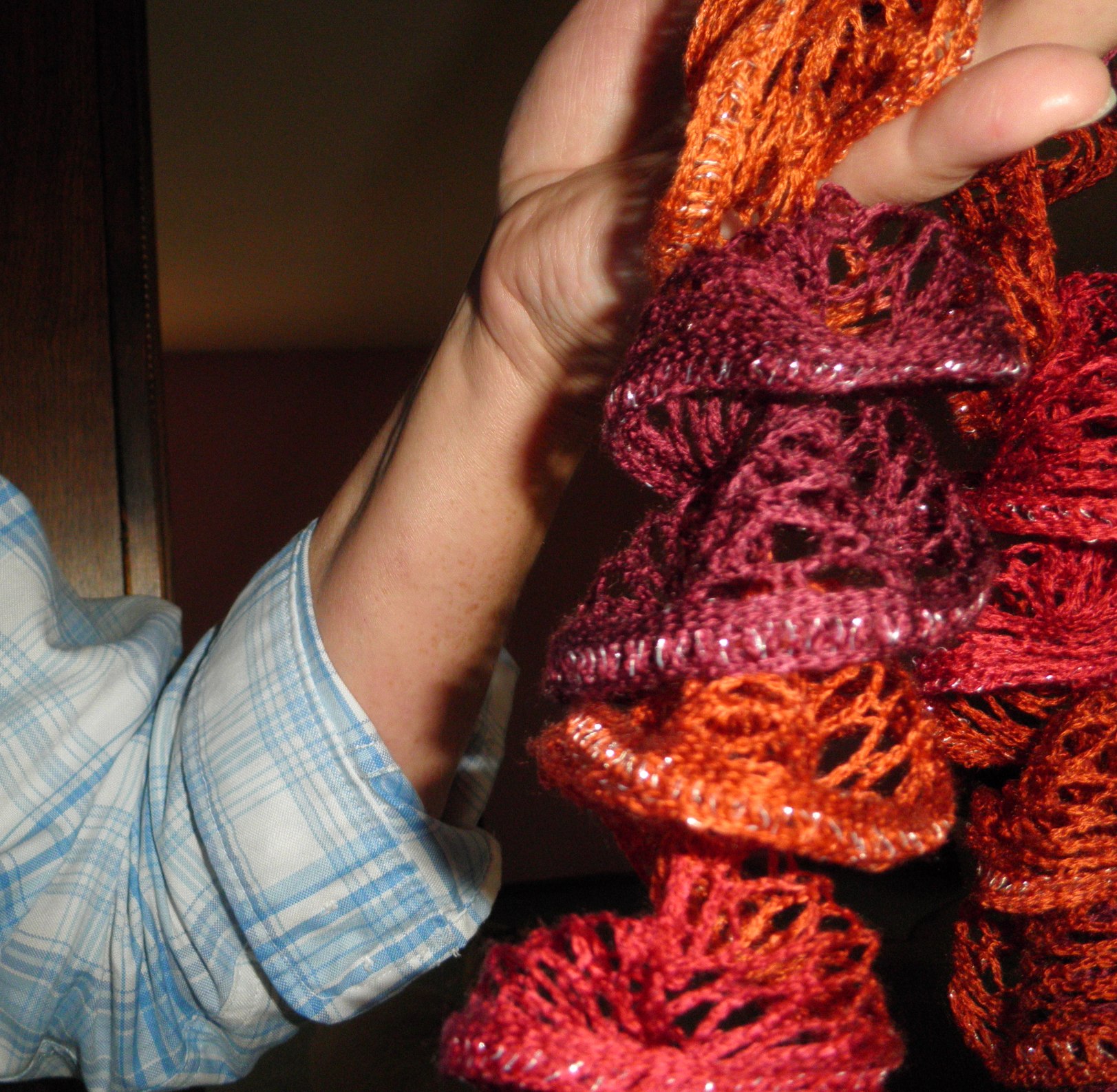 This past summer a group of us met for a birthday luncheon. My sister-in-law showed up with scarves she’d made for each one of us… because she’s just nice that way. I love mine, the colors of fall… plus I have a burgandyish blouse to wear it with.