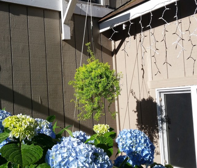 Early morning sun, hanging basket, summer flowers….. and that one, last strand of Christmas lights.